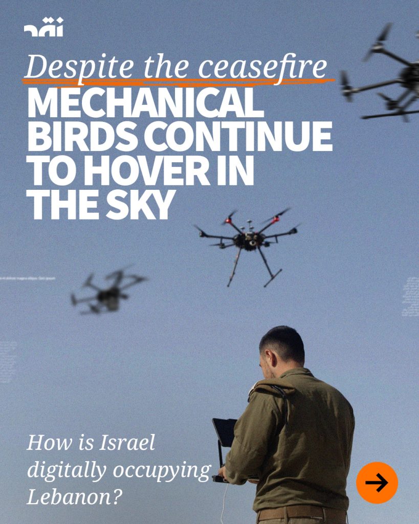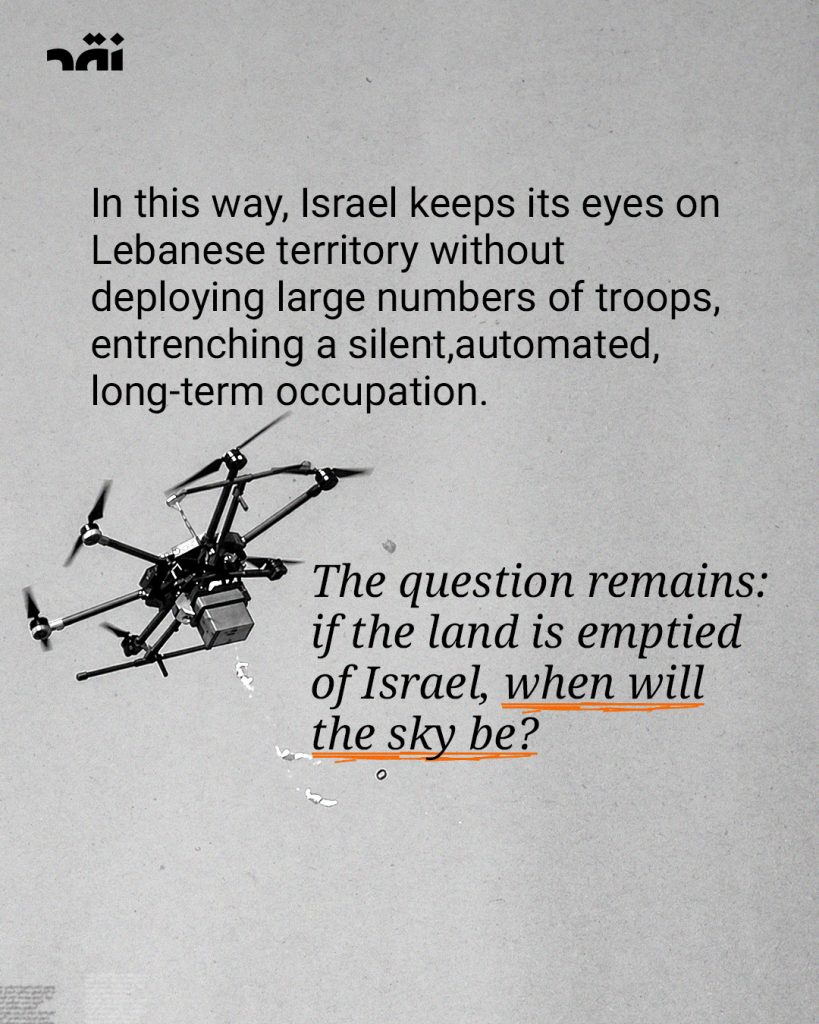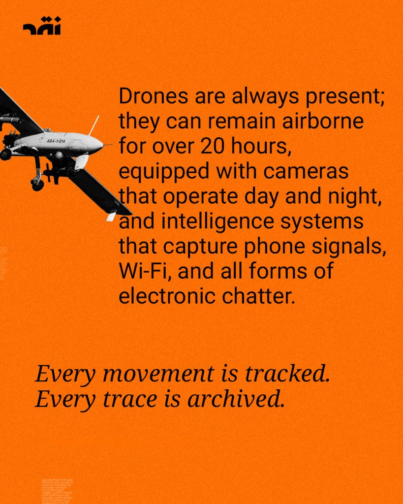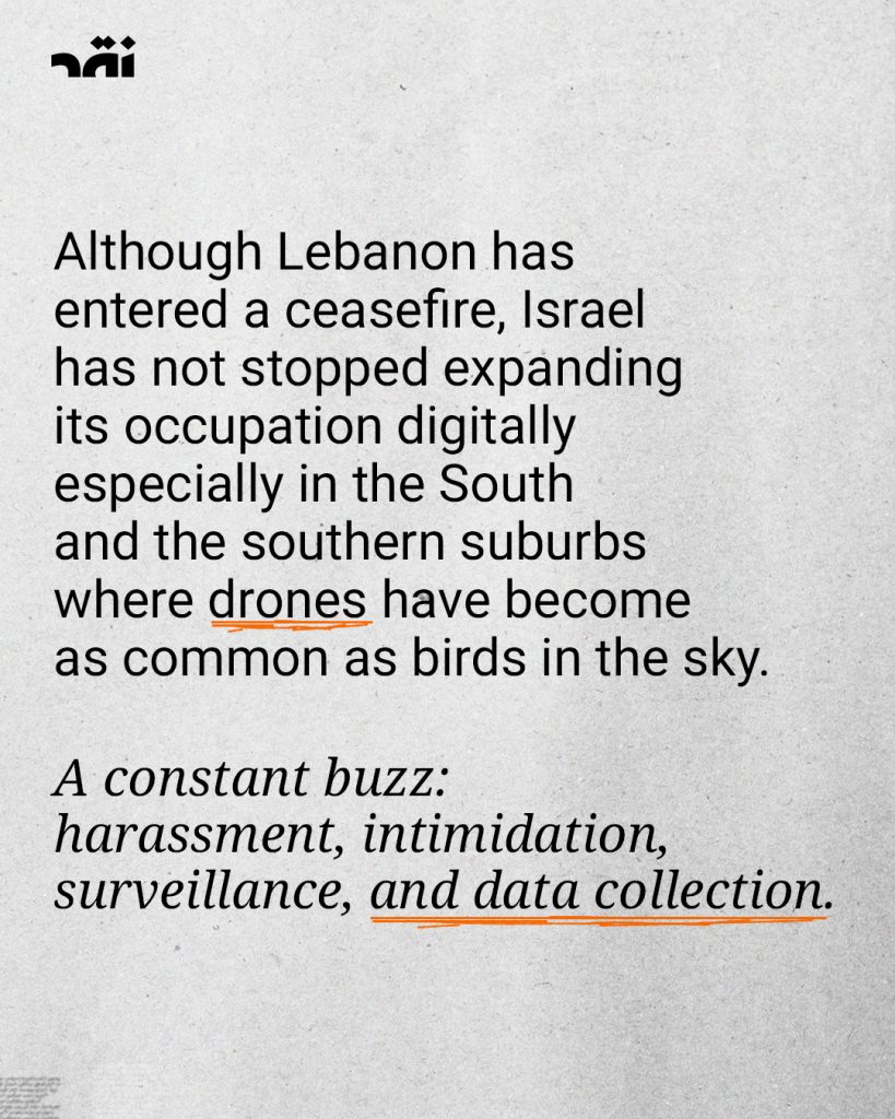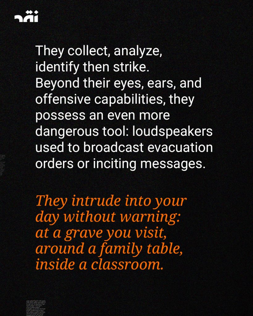 Above the skies of #Lebanon, #Israeli_drones are frequently seen surveilling the details of people’s daily lives, particularly in the South and the southern suburbs. They can identify targets or issue evacuation orders—constituting a broad form of digital occupation over the country.