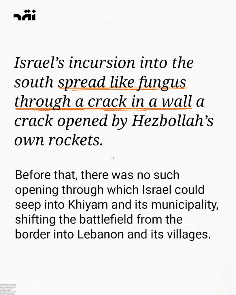 A crack opened by Hezbollah when it launched its six rockets. Before that, Israel’s “fungus” had no opening through which to enter Khiam and its municipality—shifting the battle from the border into the heart of Lebanon and its villages.